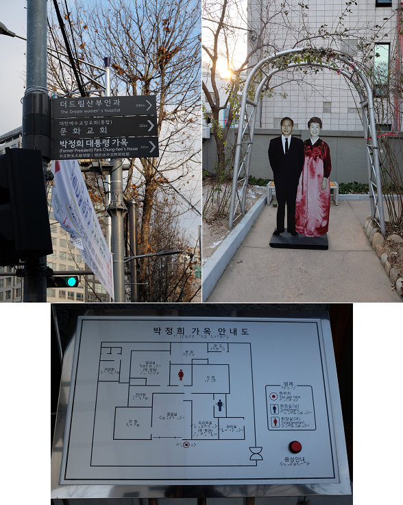 이 곳은 신당역에서 그리 멀지 않은 곳에 위치해 있고(서울중앙시장 맞은편), 안내 표지판도 '박정희 대통령 가옥'이라고 명확히 써놨다. 주택가에 있기 때문에 5분 정도 골목길로 들어가야 하지만 청구성당이나 동화동 공영주차장을 향해가면 별로 헤매지 않고 찾을 수 있다. 목적지에 도착하면 여느 문화재처럼 관람안내판과 가옥안내도가 만들어져 있고, 집 앞마당에 들어서면 박정희와 육영수의 사진도 세워져 있다.