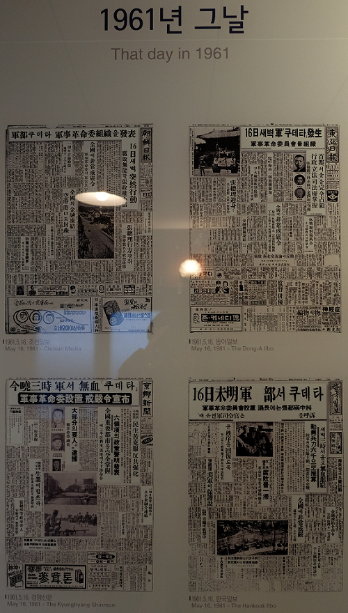 내부에는 군사쿠데타 당시 신문들도 전시되어 있는데, 경향신문이나 한국일보는 물론이고 조선일보와 동아일보의 1961년 5월 16일자 기사 제목에도 전부 다 '쿠데타'라는 표현이 들어가 있다는 게 눈에 띈다. 이때에도 분명히 쿠데타라고 했는데, 박근혜 정권의 공직 후보자들은 도대체 왜 하나같이 인사청문회에서 그토록 쿠데타라는 말을 못하고 쩔쩔매는지 참 알다가도 모를 일이다.
