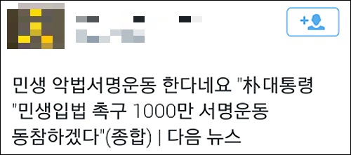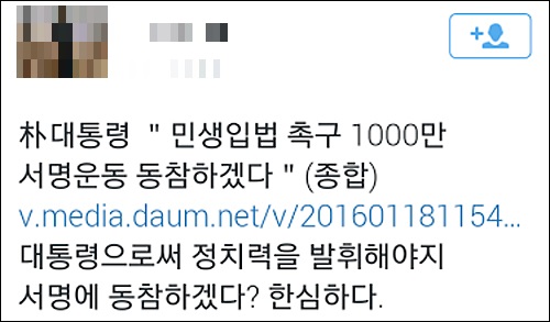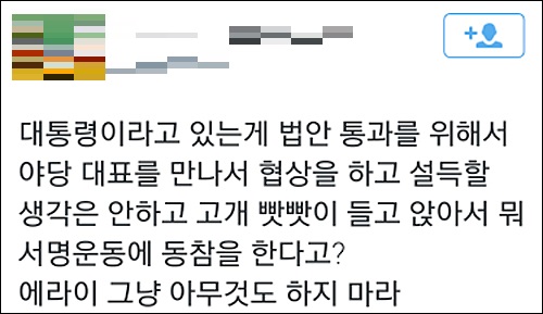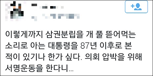 네티즌 ‘TheA********’도 총선을 앞두고 대통령의 이같은 행동에 대해 “이렇게까지 삼권분립을 개 풀 뜯어먹는 소리로 아는 대통령을 87년 이후로 본 적이 있기나 한가 싶다. 의회 압박을 위해 서명운동을 한다니…”라고 개탄했다.