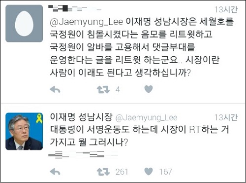 그런가하면 이재명 시장은 “이재명 성남시장은 세월호를 국정원이 침몰시켰다는 음모를 리트윗하고 국정원이 알바를 고용해서 댓글부대를 운영한다는 글을 리트윗하는군요. 시장이란 사람이 이래도 된다고 생각하십니까?”라는 한 네티즌의 주장에 대해 “대통령이 서명운동도 하는데 시장이 RT하는 거 가지고 뭘 그러시나?”라며 박 대통령의 입법 촉구 서명 참여를 우회적으로 비판했다.