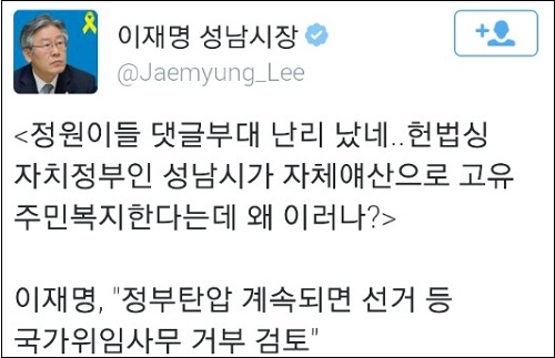 앞서 이 시장은 “이재명, ‘정부탄압 계속되면 선거 등 국가위임사무 거부 검토”란 제목의 기사 링크를 공유하며 “정원이들 댓글부대 난리 났네.. 헌법상 자치정부인 성남시가 자체예산으로 고유 주민 복지한다는데 왜 이러나?”라는 글을 남겼다.