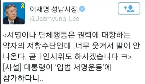 박근혜 대통령이 ‘경제 관련 입법’ 촉구를 위해 경제단체들이 벌이는 1천만 서명운동에 직접 참여한 것과 관련, 이재명 성남시장은 “서명이나 단체행동은 권력에 대항하는 약자의 저항수단”이라며 “너무 웃겨서 말이 안 나온다. 곧 1인 시위도 하시겠습니다”라고 냉소했다.