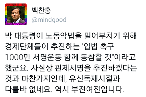백찬홍 씨알재단 운영위원도 “사실상 관제서명을 추진하겠다는 것과 마찬가지인데, 유신독재시절과 다를 바 없다”며 “역시 부전여전”이라고 비판했다.