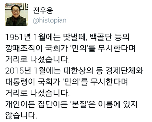 또 전 박사는 “1951년 1월에는 땃벌떼, 백골단 등의 깡패조직이 국회가 ‘민의’를 무시한다며 거리로 나섰다”며 “2016년 1월에는 대한상의 등 경제단체와 대통령이 국회가 ‘민의’를 무시한다며 거리로 나섰다. 개인이든 집단이든 ‘본질’은 이름에 있지 않다”고 일갈했다.