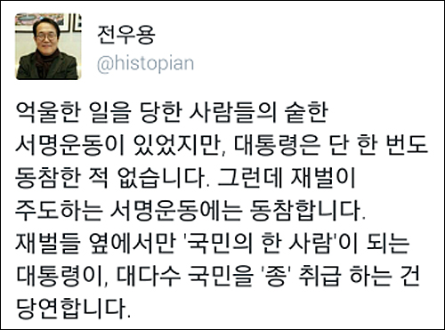 역사학자 전우용 박사는 트위터에서 “억울한 일을 당한 사람들의 숱한 서명운동이 있었지만, 대통령은 단 한 번도 동참한 적 없다”며 “그런데 재벌이 주도하는 서명운동에는 동참한다, 재벌들 옆에서만 ‘'국민의 한 사람’이 되는 대통령이, 대다수 국민을 ‘종’ 취급 하는 건 당연하다”고 비판했다.