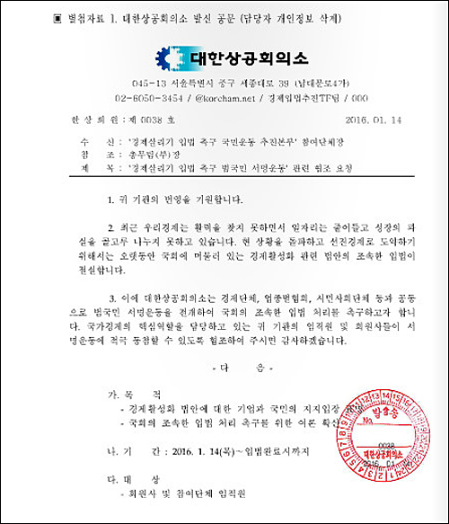 공개된 자료에 따르면 대한상의는 지난 14일 전국경제인연합회, 중소기업중앙회, 전국은행연합회, 금융투자협회 등 32개 경제단체·업종별 협회에 <‘경제살리기 입법 촉구 국민운동 추진본부’ 관련 협조 요청>이란 제목의 공문을 보냈다.