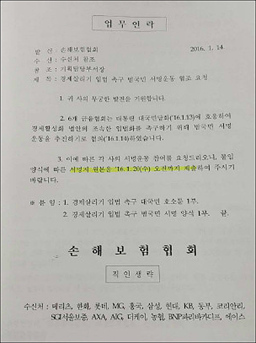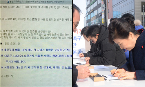 전국사무금융서비스노동조합, 참여연대, 정의당 박원석 의원은 20일 경제단체와 6개 금융협회가 박 대통령의 13일 신년 담화 다음날인 14일 소속 기업‧기관들에게 임직원 등으로부터 ‘입법 촉구’ 서명을 받아 줄 것을 요청한 공문들을 공개했다.