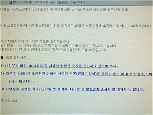 이와 관련 금융‧보험업계 종사자로 보이는 한 네티즌은 인터넷 커뮤니티에 지난 14일 대한상의의 공문 메일을 공개했다. 그는 대한상의가 은행연합회, 금융투자협회, 생명보험협회, 손해보험협회, 상호저축은행중앙회, 여신금융협회 등 6개 단체 소속 기업들에 공문을 보내왔다며 “임직원들에게 경제살리기 법안 입법 촉구 동의서를 받아달라고 했다”고 말했다.