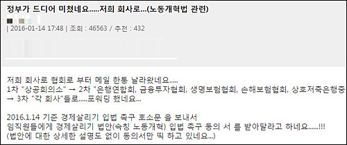“금융권 구조조정이 많은데 어떻게 될지 걱정부터 앞서네요”, “노동개혁 TV광고, 지하철 광고만 봐도 화가 치밀어 오르는데 진짜 가지가지하네요”, “독이 되는지도 모르고 동의서에 사인하는 사람이 분명 있을 듯, 욕만 나오네요”, “이거 공공부분은 짤없이 동의서를 쓰게 되겠는데요” 등의 분노와 우려를 쏟아냈다.