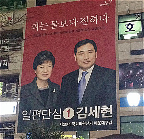 22일 SNS와 인터넷 커뮤니티에는 새누리당 부산 해운대(갑) 김세현 예비후보이 지역 사무실 외부에 내건 대형 현수막 사진이 올라왔다.