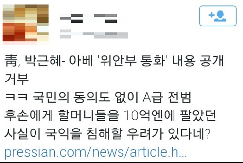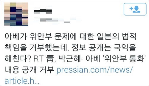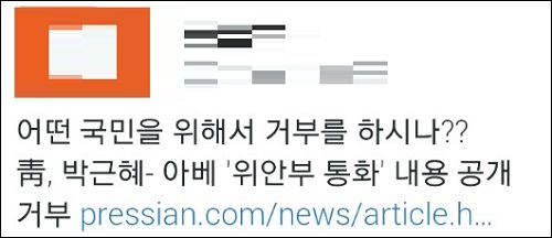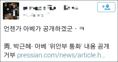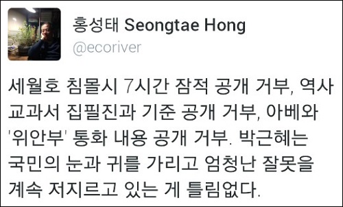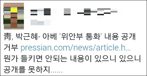 청와대가 ‘국익’을 이유로 박 대통령과 아베 총리의 통화내용 공개를 거부하자 상지대 홍성태 교수는 “세월호 침몰시 7시간 잠적 공개 거부, 역사 교과서 집필진과 기준 공개 거부, 아베와 ‘위안부’ 통화내용 공개 거부. 박근혜는 국민의 눈과 귀를 가리고 엄청난 잘못을 계속 저지르고 있는 게 틀림없다”고 주장했다.