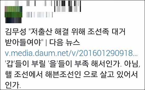 트위터에도 “헬조선을 만들어 놓고 이제 조선족을 데려와 출산율 높이자고? 자국민은 버린 거냐? 현실과 동떨어진 대책만 내놓는...노답이다, 정말”(aus*****), “삼성의 외국노동자 천만명 유입 제안과 같은 맥락. 이들이 사람, 특히 자국민을 사람이 아니라 가축으로 보는구나. 그러면 설명이 된다. 세월호, 일본군 성노예 등을 왜 그렇게 처리했는지”(kim******), “우리 젊은이들을 제대로 살게 해서 자연스럽게 출산율을 높일 생각을 하지 않고 이 무슨 개소리냐! 국민이 노동력을 제공하는 노예냐?”(new********) 등의 글이 올라왔다.