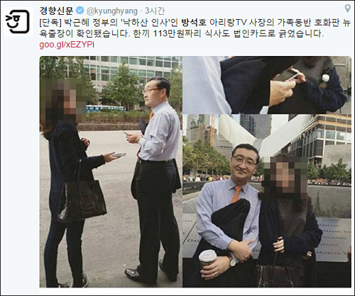 관련 경향신문은 1일 방석호 사장이 박근혜 대통령이 유엔총회 연설을 하던 지난해 9월 미국 출장을 가면서 가족들을 동반해 현지에서 최고급 차량을 빌리고 호화 레스토랑과 쇼핑몰 등을 돌아다닌 것으로 드러났다고 보도했다.