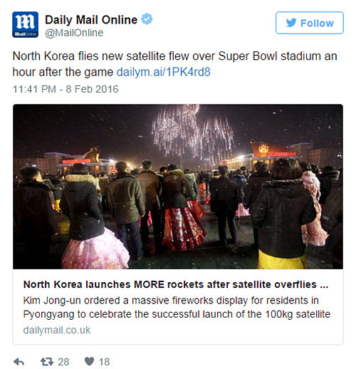 북한이 경기 한시간 후에 슈퍼볼 스타디엄 위로 날아간 새로운 인공위성을 날린다