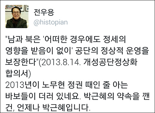 아울러 2013년 8월14일 개성공단정상화 합의서의 “남과 북은 ‘어떠한 경우에도 정세의 영향을 받음이 없이’ 공단의 정상적 운영을 보장한다”는 내용을 지적하며 전 박사는 “2013년이 노무현 정권 때인 줄 아는 바보들이 더러 있네요. 박근혜의 약속을 깬 건, 언제나 박근혜”라고 질타했다.