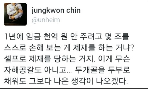 한편, 정부의 개성공단 가동 전면 중단 선언에 동양대 진중권 교수는 트위터를 통해 “(북에)1년에 임금 천억 원 안 주려고 몇 조를 스스로 손해 보는 게 제재를 하는 거냐”며 “셀프로 제재를 당하는 거지. 이게 무슨 자해공갈도 아니고...”라고 박근혜 정부를 힐난했다.