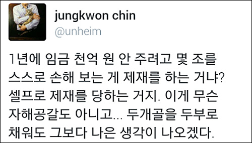 개성공단 전면 중단에 대해서도 진 교수는 “1년에 임금 천억 원 안 주려고 몇 조를 스스로 손해 보는 게 제재를 하는 거냐? 셀프로 제재를 당하는 거지”라며 “이게 무슨 자해공갈도 아니고... 두개골을 두부로 채워도 그보다 나은 생각이 나오겠다”고 원색적으로 맹비난했다.
