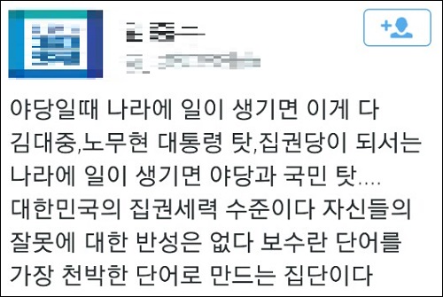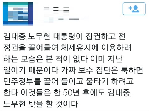 트위터 이용자 임모씨는 “김대중, 노무현 대통령이 집권하고 전 정권을 끌어들여 체제유지에 이용하려하는 모습은 본 적이 없다. 이미 지난 일이기 때문”이라며 “가짜 보수 집단은 툭하면 민주정부를 끌어 들이고 물타기 하려고 한다. 이것들은 한 50년 후에도 김대중, 노무현 탓을 할 것”이라고 지적했다.