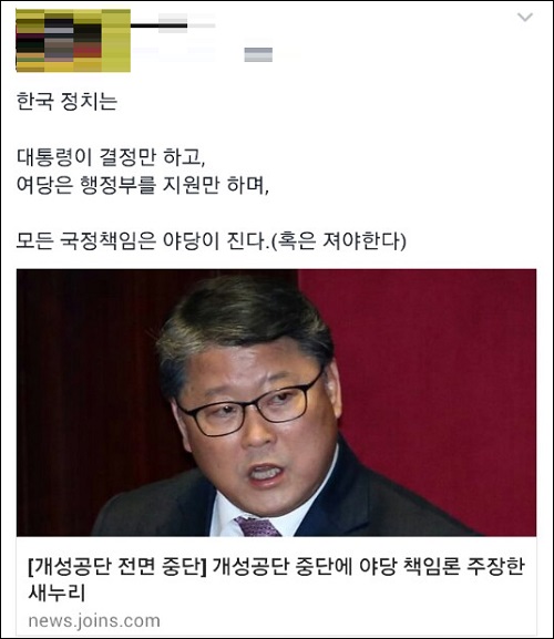 한 페이스북 이용자는 “한국 정치는 대통령이 결정만 하고, 여당은 행정부를 지원만 하며, 모든 국정책임은 야당이 진다.(혹은 져야한다)”고 꼬집었다.