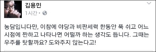 여당의 이 같은 주장에 대해 방송인 김용민 씨는 “이 참에 야당과 비판세력 한동안 푹 쉬고 어느 시점에 짠하고 나타나면 어떨까하는 생각도 든다”면서 “그 때는 우주를 탓할까요? 도와주지 않는다고!”라고 비꼬았다.
