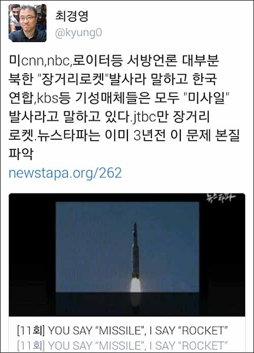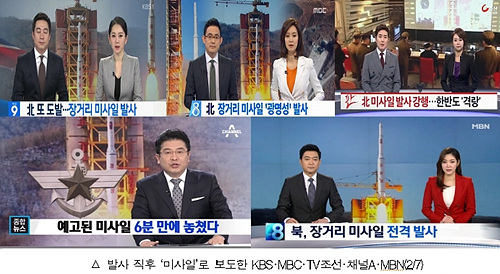 7일 로켓 발사 실험을 한 북한은 위성을 궤도에 진입시켰다고 주장했고, 국방부도 이 점은 인정한 만큼 표면적으로는 위성 로켓인 셈이다. 그러나 우리 정부는 북한의 발사 실험마다 이를 미사일로 발표했고 방송사들도 검증 없이 이를 따르고 있다. ‘장거리 로켓’이라는 중립적 용어를 사용한 방송사는 SBS와 JTBC뿐이고 그나마도 SBS는 하루 만에 철회했다. 객관성과 중립성이 무엇보다 핵심적인 가치인 언론 보도에서 전쟁과 밀접한 ‘미사일’을 단정적으로 사용하는 행태는 부적절하다.