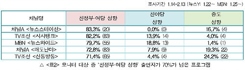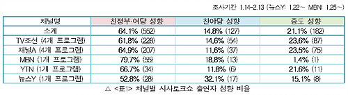 출연진 구성의 불균형이 가장 심한 프로그램은 채널A <뉴스스테이션>으로, ‘친정부․여당’의 비율이 83.3%를 차지한 반면, ‘친야당 성향’ 출연자는 단 한명도 없었다(<표2> 참조).