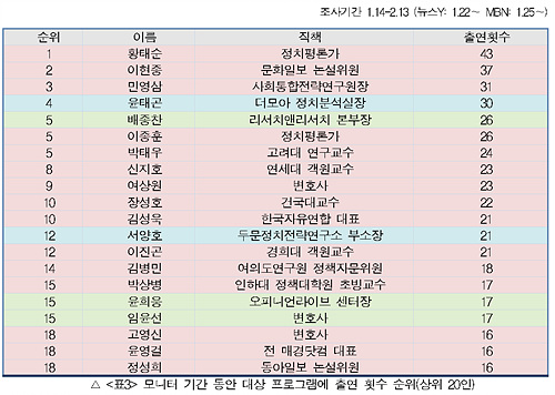 모니터 기간 동안 여러 프로그램에 겹치기 출연하면서 가장 많이 나온 사람은 정치평론가 황태순 씨다. 모니터 대상 프로그램에서만 43회 출연했다. 20명 중 15명이 ‘친정부·여당 성향’ 출연자였고, 2명이 ‘친야당 성향’, 3명이 ‘중도성향’을 보였다. 특히 야당에 대한 막말로 여러 차례 지적된 황태순, 이현종, 민영삼, 박태우, 여상원, 장성호, 고영신, 윤영걸 씨 등이 눈에 띈다.