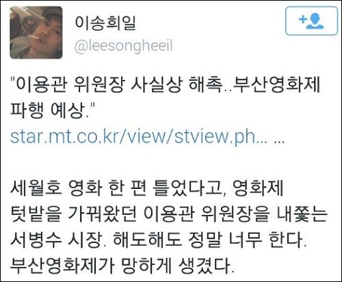 또 <야간비행>의 이송희일 감독은 “세월호 영화 한 편 틀었다고, 영화제 텃밭을 가꿔왔던 이용관 위원장을 내쫓는 서병수 시장. 해도 해도 정말 너무 한다”며 “부산영화제가 망하게 생겼다”고 우려를 나타냈다.