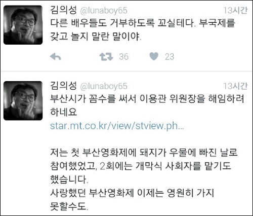 영화배우 김의성 씨는 “저는 첫 부산영화제에 ‘돼지가 우물에 빠진 날’로 참여했었고, 2회에는 개막식 사회자를 맡기도 했다”고 전하면서 “사랑했던 부산영화제 이제는 영원히 가지 못할 수도..”라고 말했다.