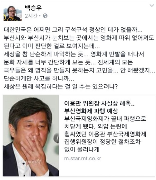 천안함 침몰 사건을 다룬 영화 <천안함 프로젝트>를 연출한 백승우 감독은 “대한민국은 어쩌면 그리 구석구석 정상인 데가 없을까”라며 “부산시와 부산시가 눈치 보는 곳에서는 영화제 따위 없어져도 된다고 이미 판단한 걸로 보여진다”고 지적했다.