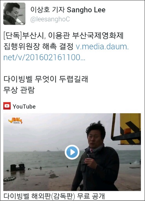 <다이빙벨> 이상호 감독은 SNS를 통해 이 위원장 해촉 소식을 전하면서 “다이빙벨 무엇이 두렵길래..”라며 개탄했다.