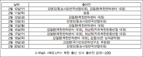 채널A <쾌도난마>는 북한이 로켓을 발사한 후 2월 10일부터 지속적으로 북한 출신 인사를 출연시키고 있다. TV조선 <시사탱크>에서도 18일과 19일 강명도 동포사랑전국연합 대표가 출연했다. 북한 출신 인사들은 북한 정권과 사회에 대한 문제제기 등을 주로 언급한다. 이러한 발언은 남북한 문제를 바라보는 또 하나의 시각을 제시한다는 점에서 의미가 있을 수 있다. 그러나 방송에서 남북한 관계를 다룰 때 다양한 접근방법을 모색하기는커녕, 북한 인사들을 반복 출연시켜 북한에 대한 부정적 인식만을 확산시키고, 대북 강경책만이 해결책인양 몰아가는 것은 바람직하지 않다. 특히 이들이 하는 핵심 주장은 “북한의 대남테러 위협가능성이 높다”며 공포감을 조성하고, “남한의 야권 진영 혹은 종북주의자들과 연계할 가능성”을 언급하며 북풍을 부채질 하고 있다. 그러면서 ‘테러방지법’을 통과시켜야한다는 주장을 반복하고 있다.