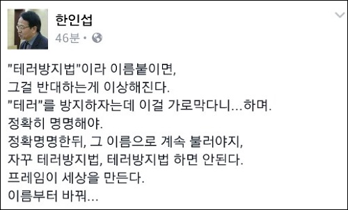 한 교수는 “정확히 명명한 뒤, 그 이름으로 계속 불러야지, 자꾸 테러방지법, 테러방지법 하면 안 된다”며 “프레임이 세상을 만든다”고 지적했다.