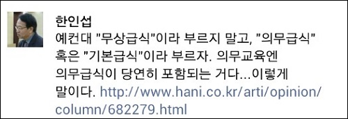 그러면서 “‘무상급식’이라 부르지 말고, ‘의무급식’ 혹은 ‘기본급식’이라 부르자. 의무교육엔 의무급식이 당연히 포함되는 거다.. 이렇게 말이다”고 예를 들었다.