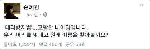 손 위원장의 게시글에 네티즌들은 “대국민테러법”, “국정원국민사찰법”, “테러빙자법”, “무소불위법”, “빅브라더법”, “정권교체방지법”, “중정부활법”, “국민감시법”, “카톡감시법”등 다양한 아이디어를 내놨다.