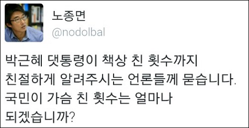 이 같은 보도에 대해 노종면 기자는 “박근혜 댓통령이 책상 친 횟수까지 친절하게 알려주시는 언론들께 묻습니다. 국민이 가슴 친 횟수는 얼마나 되겠습니까?”라고 날서게 비판했다.