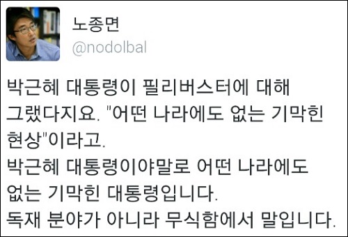 그런가하면 노종면 YTN 해직기자는 “박근혜 대통령이야말로 어떤 나라에도 없는 기막힌 대통령”이라며 “독재 분야가 아니라 무식함에서 말이다”고 힐난했다.