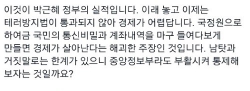 박 대통령은 24일 오전 청와대에서 주재한 제8차 국민경제자문회의에서 야당의 필리버스터로 ‘테러방지법’ 처리가 지연되자 “많은 국민이 희생을 치르고 나서 통과를 시키겠다는 얘기인지..”라며 이같이 말했다.