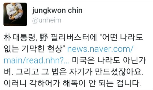 동양대 진중권 교수는 “미국은 나라도 아닌가벼. 그리고 그 법은 자기가 만드셨잖아요. 이러니 각하어가 해독이 안 되는 겁니다”라고 꼬집었다.