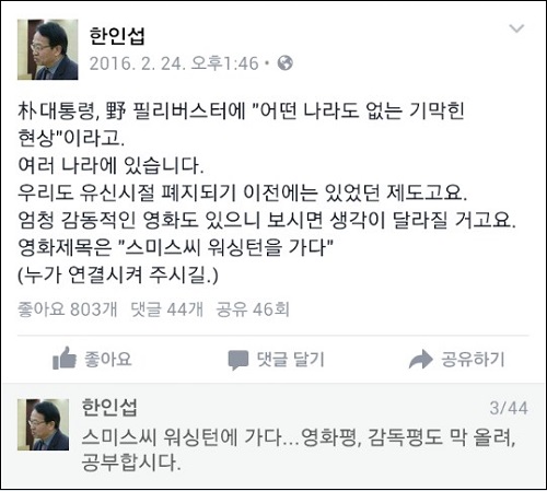 한인섭 서울대 법학전문대학원 교수도 “(필리버스터는)여러 나라에 있다”며 “우리도 유신시절 폐지되기 이전에는 있었던 제도”라고 설명해줬다.