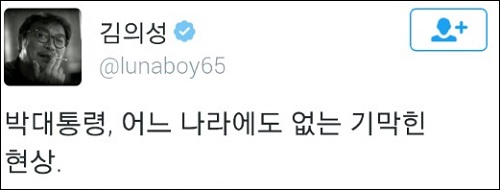 배우 김의성 씨도 “박대통령, 어느 나라에도 없는 기막힌 현상”이란 촌평으로 박 대통령의 발언을 우회적으로 비판했다.