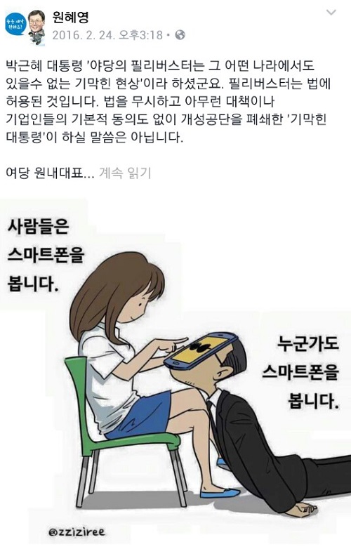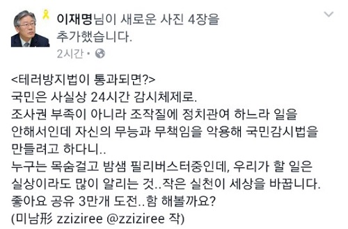 이 시장은 이어 “누구는 목숨 걸고 밤샘 필리버스터 중인데, 우리가 할 일은 실상이라도 많이 알리는 것”이라며 “작은 실천이 세상을 바꿉니다. 좋아요, 공유 3만개 도전.. 함 해볼까요?”라고 제안하며 SNS에 해당 그림을 공개했다.
