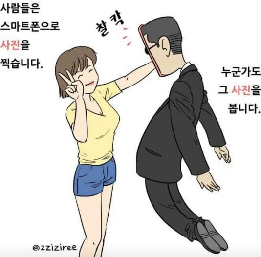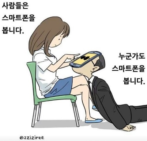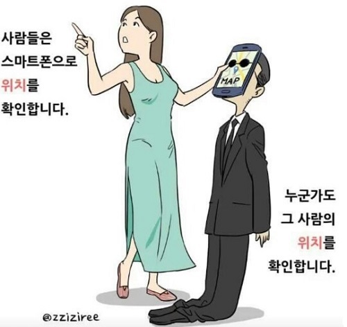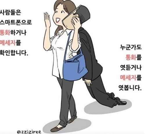 해당 그림에는 “사람들은 스마트폰을 봅니다. 누군가도 스마트폰을 봅니다”, “사람들은 스마트폰으로 사진을 찍습니다. 누군가도 그 사진을 봅니다”, “사람들은 스마트폰으로 통화하거나 메시지를 확인합니다. 누군가도 통화를 엿듣거나 메시지를 엿봅니다”, “사람들은 스마트폰으로 위치를 확인합니다. 그 누군가도 그 사람의 위치를 확인합니다”란 문구가 적혀 있다.