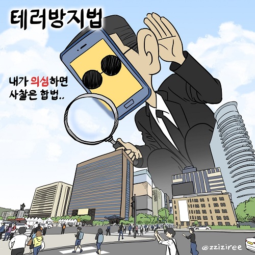 야당 의원들이 무제한토론(필리버스터)을 벌이며 국회 통과를 막고 있는 ‘테러방지법’이 ‘국정원강화법’이라는 비판을 받고 있는 가운데, SNS상에서는 지난해 한 트위터 이용자가 그린 국가정보원의 불법 해킹 의혹을 비판한 4장의 그림이 네티즌들의 관심을 받고 있다.