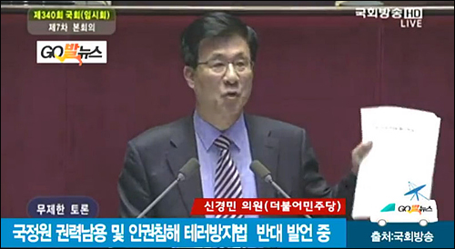 ‘국정원 강화 악법’ 논란을 빚고 있는 테러방지법 저지를 위한 필리버스터 8번째 주자로 25일 단상에 오른 신경민 더불어민주당 의원은 “국회 정보위원회 3년, 기자로서 국정원을 직접 경험했던 얘기들을 하겠다”고 말했다.