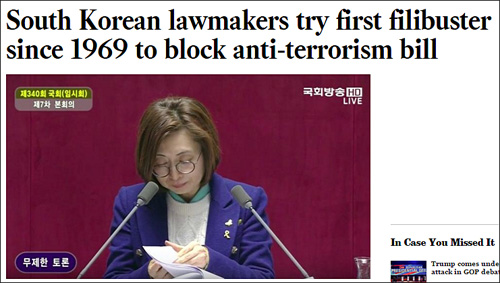 한국에서 박근혜 정권의 국정원 권한 확대를 통한 국민 통제를 위한 ‘테러방지법’의 통과를 저지하기 위한 더민주당을 비롯한 야당의원들의 눈물겨운 필리버스터 투쟁이 진행되고 있는 가운데 미국의 주력 일간지인 LA타임스가 이를 주목하고 기사화 했다.