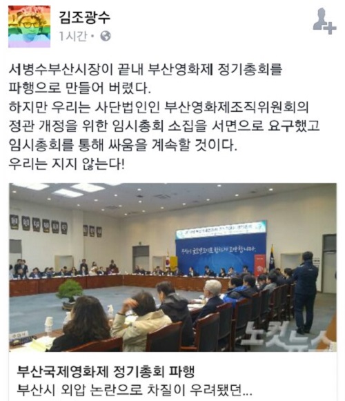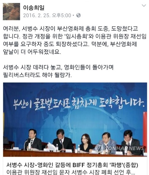 그런가하면 이송희일 감독은 “정관개정을 위한 ‘임시총회’와 이용관 위원장 재선임 여부를 요구하자 (서병수 시장이) 중도 퇴장하셨다고. 덕분에, 부산영화제 앞날이 더 어두워졌네요”라고 개탄했다.