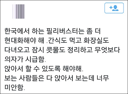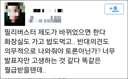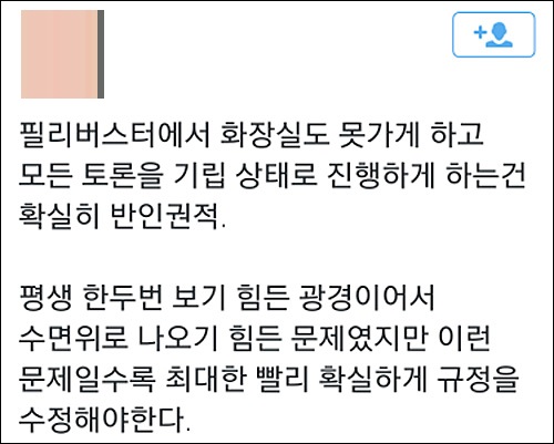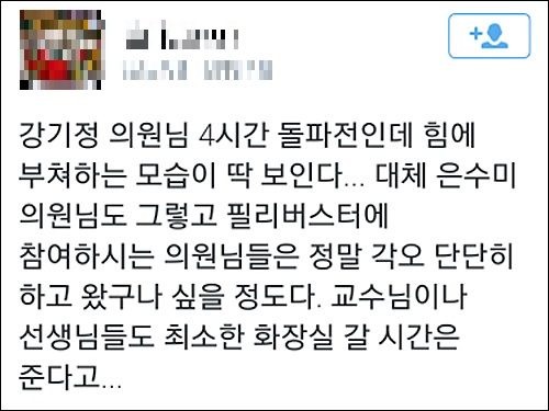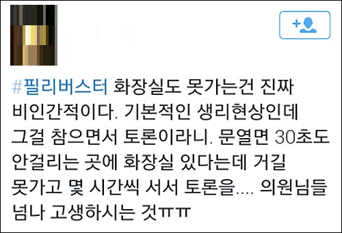 이 부의장의 문제제기에 SNS에서는 “물이랑 화장실 정돈 가게 해줘야 하는 것 아니야?”(733***), “이번 총선 끝나고 나면 필리버스터 화장실은 갔다 올 수 있게 가벼운 음료는 마실 수 있게 스탠딩의자에 앉아 발언하게 해 줬으면 좋겠다”(ein***), “한국에서 하는 필리버스터는 좀 더 현대화해야 해. 간식도 먹고 화장실도 다녀오고 잠시 콧물도 정리하고 무엇보다 의자가 시급함”(mjf***), “인간적으로 최소한의 쉬는 시간은 주어야 한다. 화장실조차 가지 못하는 것은 끔찍하다”(pyo****), “진짜 비인간적이다. 기본적인 생리현상인데 그걸 참으면서 토론이라니”(dra******), “대체 은수미 의원님도 그렇고 필리버스터에 참여하시는 의원님들은 정말 각오 단단히 하고 왔구나 싶을 정도다. 교수님이나 선생님들도 최소한 화장실 갈 시간은 준다고...”(@2nd*******) 등의 의견이 올라왔다.