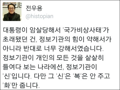 이어 “대통령이 암살당해서 ‘국가비상사태’가 초래됐던 건, 정보기관의 힘이 약해서가 아니라 반대로 너무 강해서였다”며 “정보기관이 개인의 모든 것을 샅샅이 들여다보는 나라에선, 정보기관이 ‘신’이다. 다만 그 ‘신’은 ‘복’은 안 주고 ‘화’만 준다”고 지적했다.