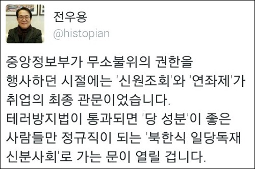 그는 또 “중앙정보부가 무소불위의 권한을 행사하던 시절에는 ‘신원조회’와 ‘연좌제’가 취업의 최종 관문이었다”며, 하지만 “테러방지법이 통과되면 ‘당 성분’이 좋은 사람들만 정규직이 되는 ‘북한식 일당독재 신분사회’로 가는 문이 열릴 것”이라고 경고했다.
